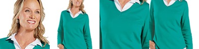 - Triple-needle coverstitched miter V-neck and armholes